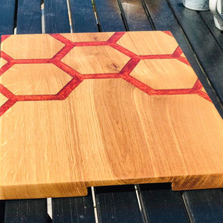 Vi tillverkar även bord och serveringsbrädor med hexanomönster i en snygg kombination av resin och trä, där du kan vara med och bestämma hur det ska se ut.